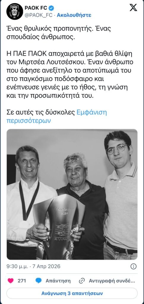 Η ΠΑΕ ΠΑΟΚ εξέφρασε τη βαθιά της θλίψη και τα ειλικρινή της συλλυπητήρια προς την οικογένεια του Μιρτσέα Λουτσέσκου ο οποίος έφυγε από τη ζωή, αφήνοντας πίσω του μια σπουδαία παρακαταθήκη στο παγκόσμιο ποδόσφαιρο.