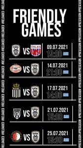 Ο ΠΑΟΚ θα έχει συνολικά πέντε φιλικά τεστ, κατα την διάρκεια της προετοιμασίας με την ΠΑΕ να αναρτά το πλήρες πρόγραμμα και τις ώρες διεξαγωγής των αγώνων. Ένα φιλικό θα γίνει σε Ελληνικό έδαφος και τα υπόλοιπα επι Ολλανδικού εδάφους.