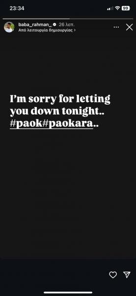 Ο Μπάμπα Ράχμαν, μέσω ανάρτησής του στο Instagram, ζήτησε δημόσια συγγνώμη για την αποβολή του στον αγώνα στο ΟΑΚΑ, η οποία κόστισε στον ΠΑΟΚ.
