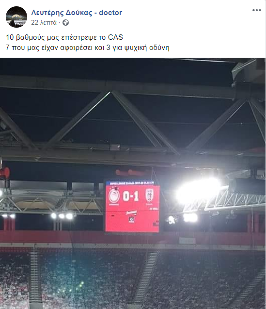 Συγκεκριμένα ανέβασε μια φωτογραφία από το matrix του Γ. Καραϊσκάκης που δείχνει το σκορ και έγραψε«10 βαθμούς μας επέστρεψε το CAS. 7 που μας είχαν αφαιρέσει και 3 για ψυχική οδύνη».