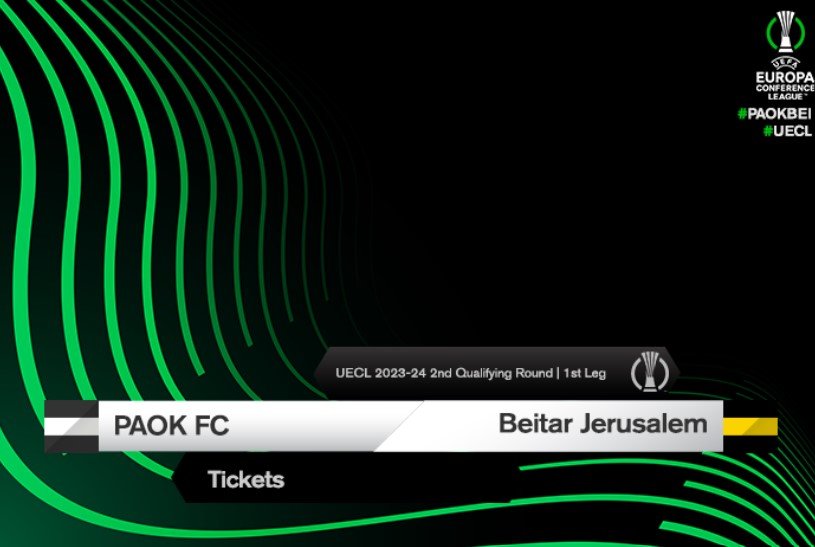 Η ΠΑΕ ΠΑΟΚ ανακοινώνει ότι την Τετάρτη (26.07) στις 09:00 θα ξεκινήσει η ηλεκτρονική διάθεση των εισιτηρίων του αγώνα ΠΑΟΚ-Μπειτάρ Ιερουσαλήμ για τον 2ο προκριματικού γύρο του Uefa Europa Conference League 2023-24 που θα διεξαχθεί την Πέμπτη (27.07, 20:30) στο γήπεδο της Τούμπας.