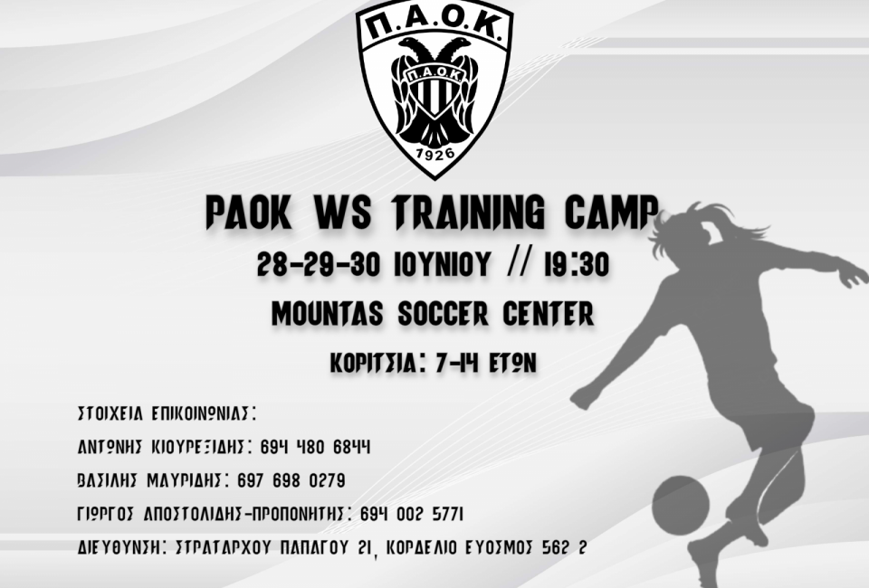 Συνεχίζονται οι προετοιμασίες για το προπονητικό καμπ επιλογής κοριτσιών, το τριήμερο 28-30 Ιουνίου, στις 19:30 το απόγευμα, στο Mountas Soccer Center, Στρατάρχου Παπάγου 21 (Κορδελιό Εύοσμος). Η συμμετοχή στο καμπ είναι ΔΩΡΕΑΝ, και θα γίνει αξιολόγηση για κάθε συμμετάσχουσα, από τον αρχιπροπονητή των ακαδημιών του ΠΑΟΚ και βοηθό προπονητή της Α΄ ομάδας, Γιώργο Αποστολίδη.