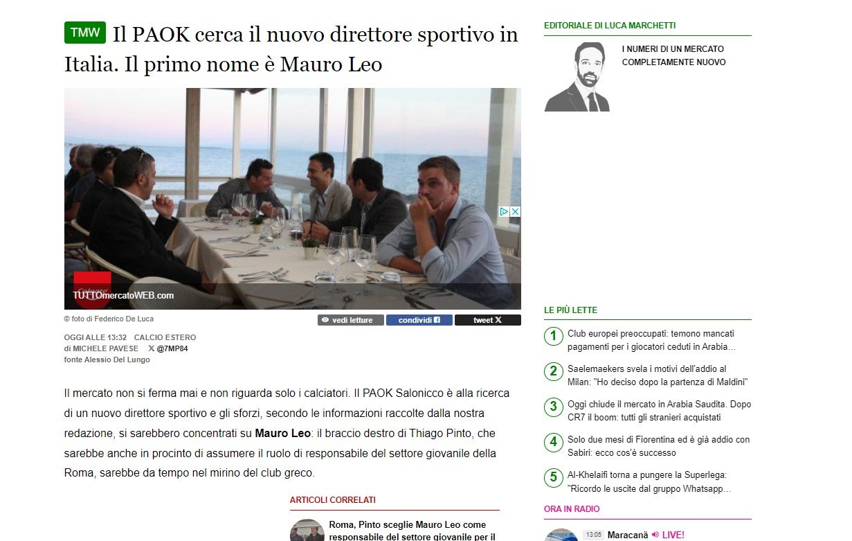 Συγκεκριμένα το ρεπορτάζ της ιστοσελίδας «TuttoMercato» αναφέρει πως «Ο ΠΑΟΚ αναζητά νέο αθλητικό διευθυντή και οι προσπάθειες, σύμφωνα με τις πληροφορίες μας, εστιάζονται στον Μάουρο Λέο: το δεξί χέρι του Τιάγκο Πίντο».