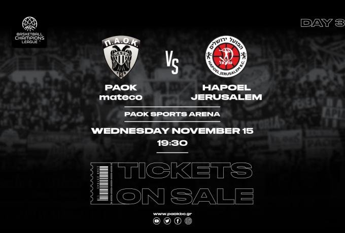Η ΚΑΕ ΠΑΟΚ mateco ανακοινώνει ότι ξεκίνησε η διάθεση των εισιτηρίων για τον αγώνα ΠΑΟΚ mateco – Hapoel Bank Yahav Jerusalem, που θα διεξαχθεί στο PAOK Sports Arena, την Τετάρτη 15 Νοεμβρίου 2023, στις 19:30, για την 3η αγωνιστική του Basketball Champions League.